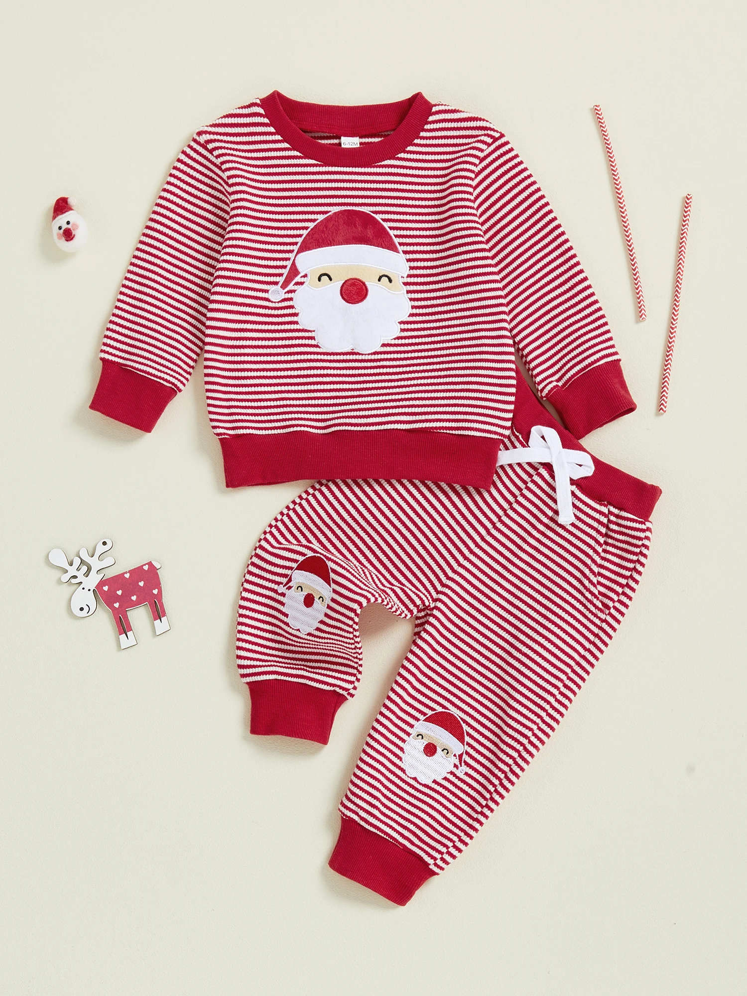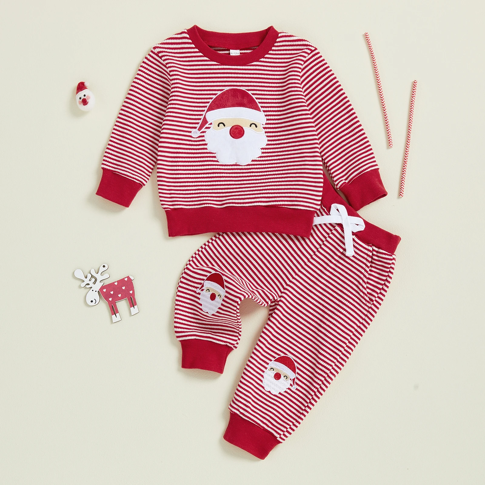 Toddler Baby Striped Set Fashionable Santa Claus Embroidery Long Sleeve Pullover with Pants 2 Pcs Christmas Outfit