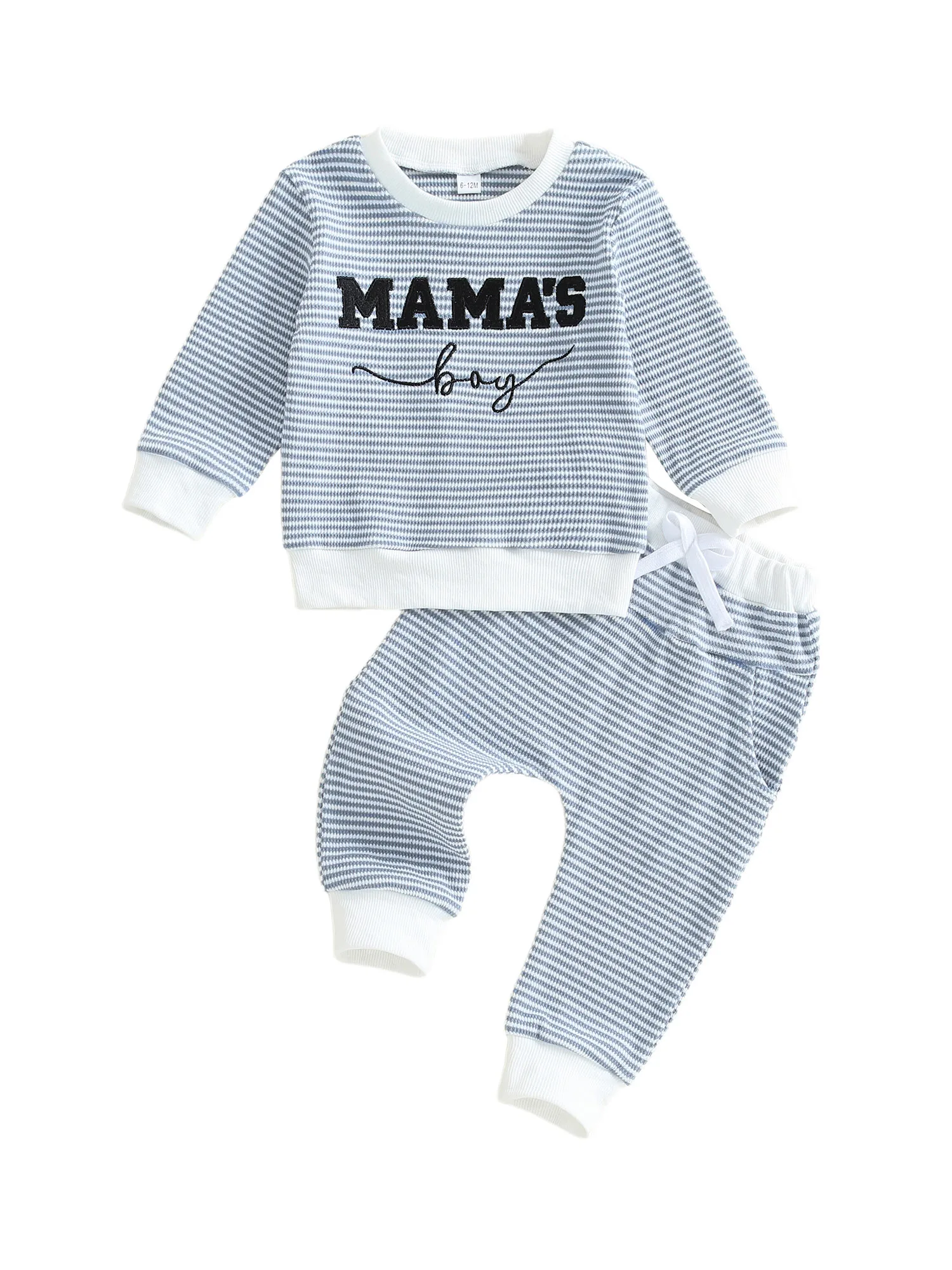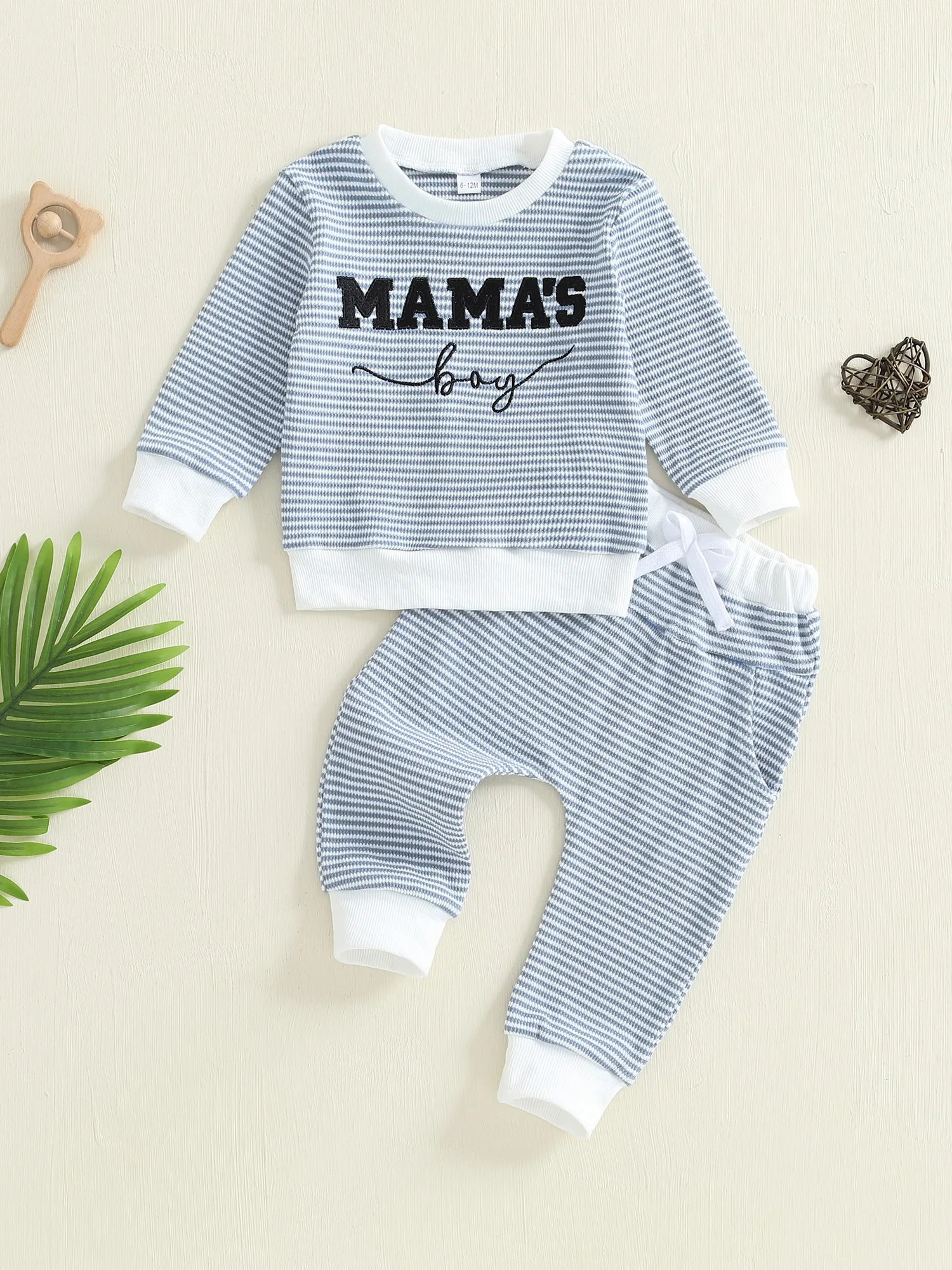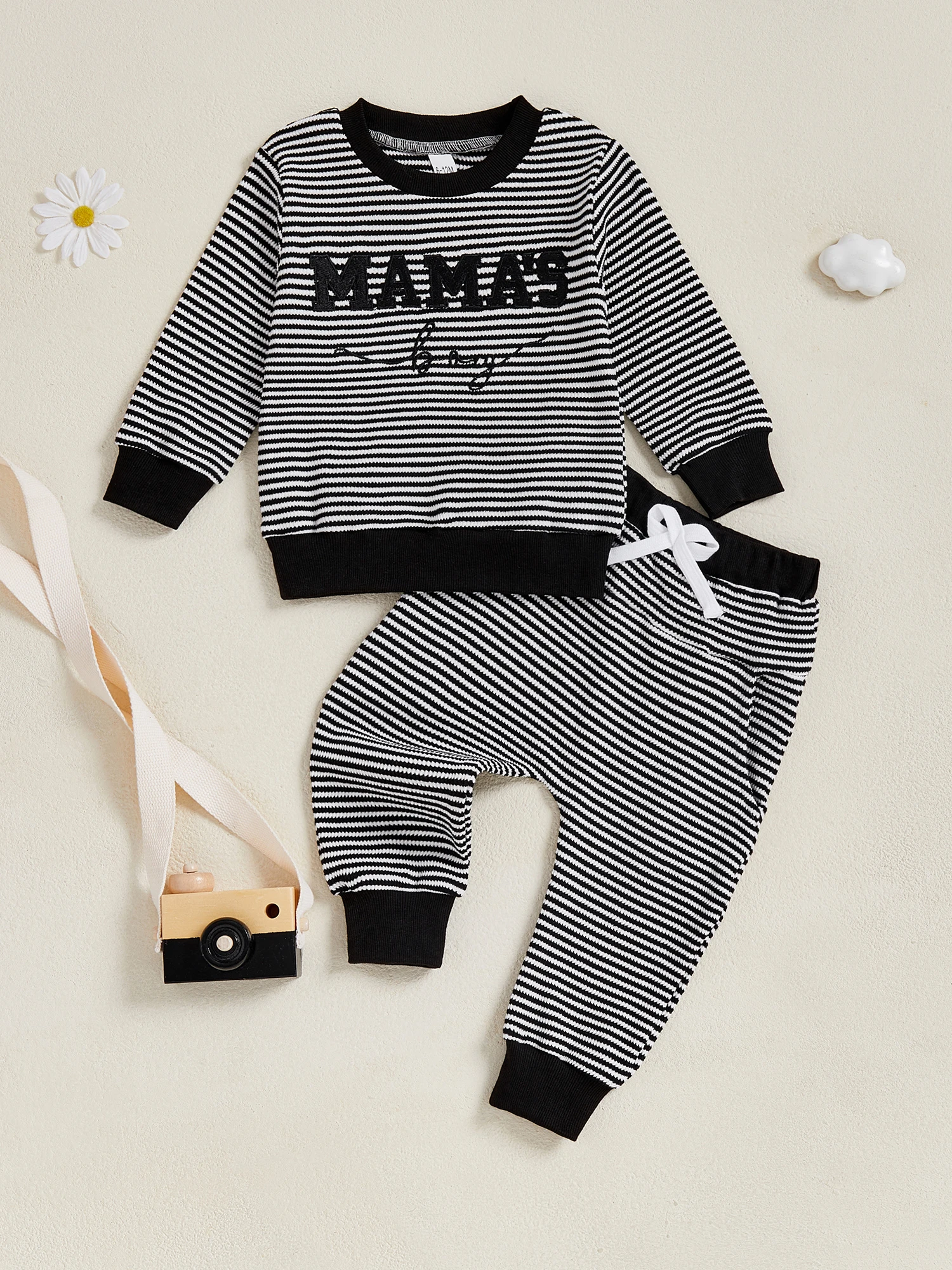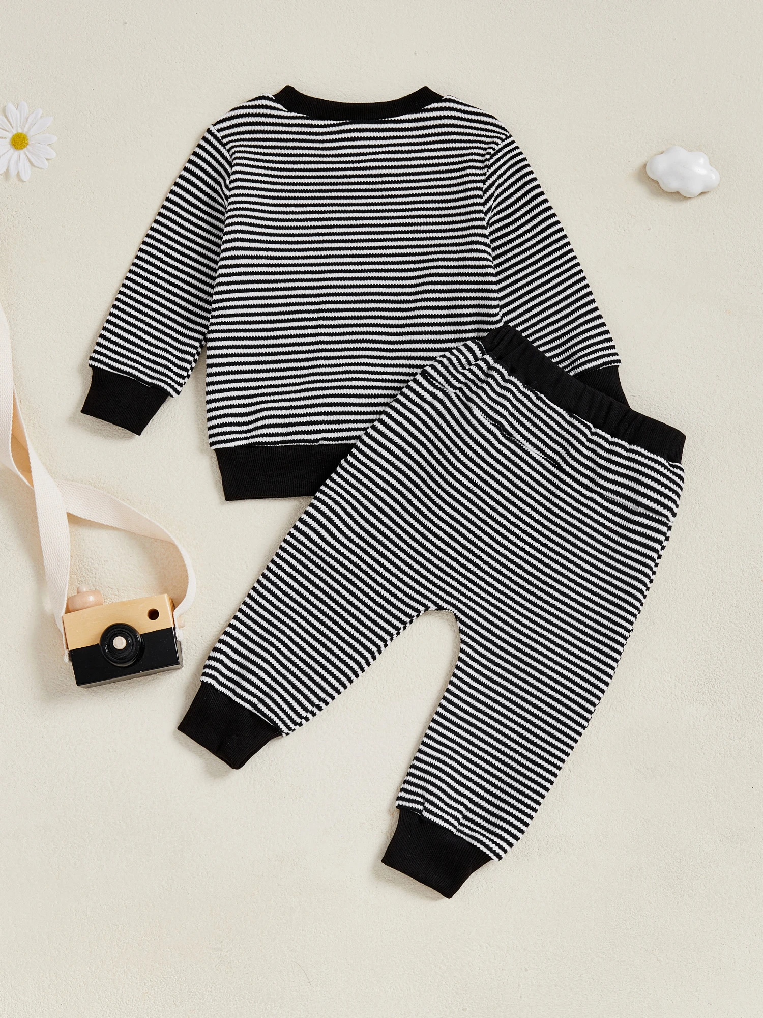 Toddler Baby Boy Fall Outfit Letter Embroidered Striped Crew Neck Long Sleeve Tops and Pants 2 Pcs Set